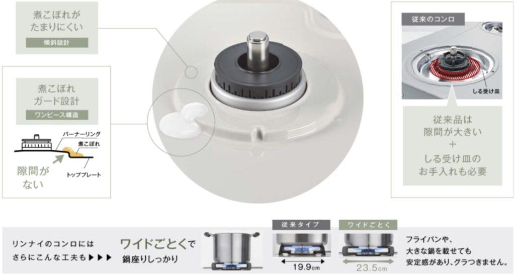 バーナーまわりの隙間がなくなり、コンロ内部への煮こぼれ・侵入を防ぎます。
