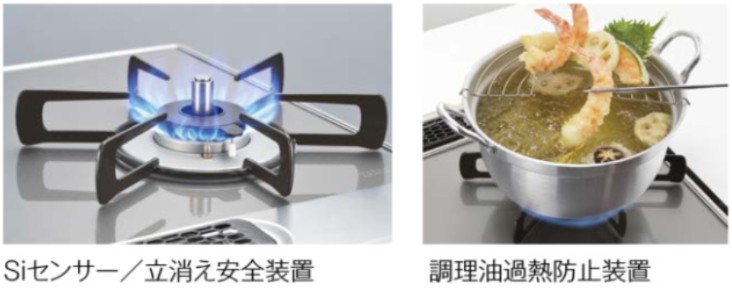 「消し忘れ消化機能」「立消え安全装置」「調理油過熱防止装置」「焦げつき消化機能」などが標準装備されています。