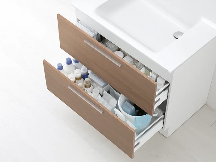 2段引出しなので出し入れしやすく、収納物がひと目で見渡せるたっぷりの収納スペースです。