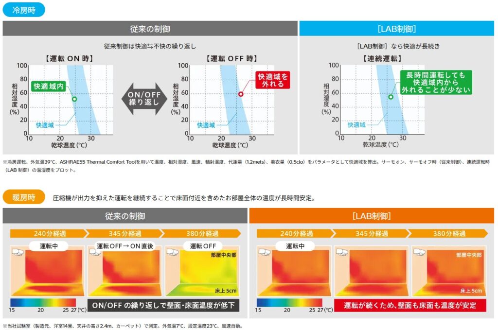 エアコンの運転時間のほとんどは設定温度に達した後の安定時です。「LAB制御」は安定時に、節電効果が期待できる環境(住宅断熱性能、外気温度、お部屋の状況など)と判断したらエアコンの運転を低出力に自動切替。運転・停止の頻度を抑えることで室内温度と湿度を安定させ快適に。 -