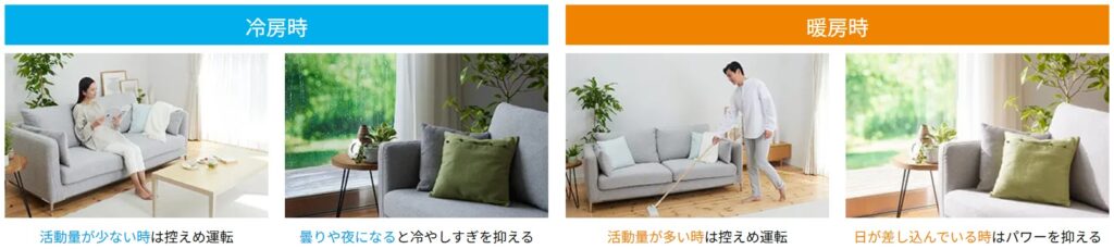 暖房・冷房運転中に「eco」ボタンを押すと、センサーが人の動きと日差しの変化を見分けて、お部屋の状況に合わせた快適&省エネ運転を行います。 -