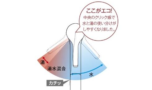 今までどおりの使い方で節約可能。 従来のシングル混合水栓は、よく使われるレバー中央部では水と湯が混ざって出るため、気づかないうちに給湯機が作動して、お湯の無駄遣いに。エコシングル水栓は、水と湯の境にクリック感を作ることで、水と湯がきちんと使い分けでき無意識によるエネルギーの無駄な消費を防ぐことができます。