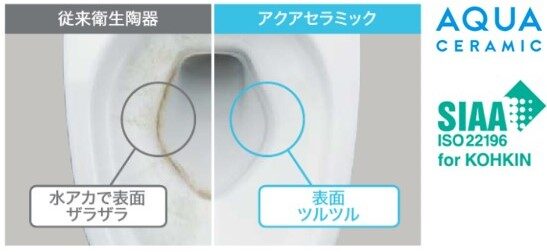 従来陶器では防げなかった水アカの固着を、化学的に防ぐ「アクアセラミック」は、日頃のお手入れで水アカを落とし、いつでもキレイを保てます。 -
