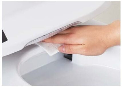 汚れが入りやすい便器とのすき間。その奥の汚れも便座がリモコン操作で真上に持ち上がるので、しっかり拭き取れます。お掃除がラクになり、においも低減できます。 -